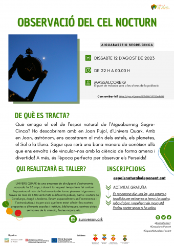 Què amaga el cel de l'espai natural de l'Aiguabarreig Segre-Cinca? Ho descobrirem amb en Joan Pujol, d'Univers Quark. Amb en Joan, astrònom, ens acostarem al món dels estels, els planetes, el Sol o la Lluna. Segur que serà una bona manera de conèixer allò que ens envolta i de vincular-nos amb la ciència de forma amena i divertida! A més, és l'època perfecta per observar els Perseids!
