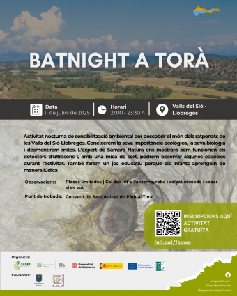 Activitat nocturna de sensibilització ambiental per descobrir el món dels ratpenats de les Valls del Sió-Llobregós. Coneixerem la seva importància ecològica, la seva biologia i desmentirem mites. L'expert de Sàmara Natura ens mostrarà com funcionen els detectors d'ultrasons i, amb una mica de sort, podrem observar algunes espècies durant l'activitat. També farem un joc educatiu perquè els infants aprenguin de manera lúdica.